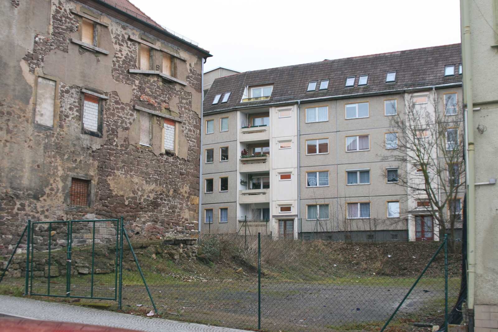 Zwei Grundstücke sind unbebaut und auf dem dritten befindet sich ein Einzeldenkmal. Dieses ist zu sanieren und kann durch Neubebauung auf den anderen beiden Grundstücken ergänzt werden. Es liegt bereits ein Planungskonzept für 35 altengerechte Wohnungen vor, Kosten: 6,5 Mio €. Das Konzept ist für die Umsetzung an diesem Standort geeignet.